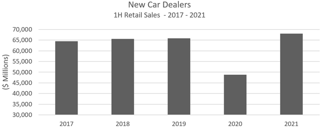Quand on examine la santé économique des concessions de véhicules neufs, les volumes de ventes de véhicules neufs ne présentent qu’une partie du tableau d’ensemble. Bien que les volumes de véhicules neufs soient en effet d’une importance cruciale, les concessions dépendent fortement des pièces et du service, des véhicules d’occasion, etc., dans le cadre de leur flux de revenus global. En ce qui concerne les ventes au détail totales, les concessions de véhicules neufs ont fortement rebondi au premier semestre de 2021. Les ventes au détail ont augmenté de 39,4 % par comparaison avec celles du 1er semestre de 2020 et ont atteint des sommets records, dépassant ceux observés en 2018 ou 2019.