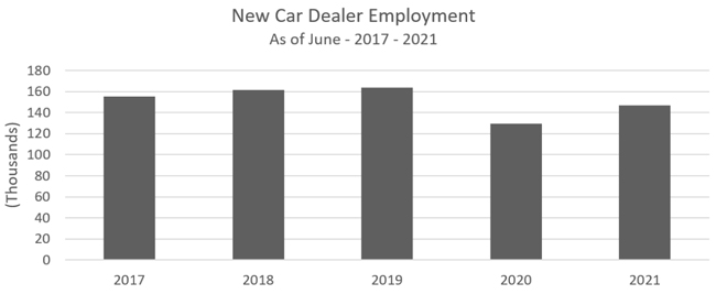 L’emploi du côté des concessions de véhicules neufs – en juin 2021 – a augmenté de 13,7 % par rapport aux niveaux d’emploi observés en juin 2020. Malgré les ventes record observées par les concessions, les niveaux d’emploi n’ont pas encore atteint ceux observés en 2019, demeurant inférieurs de 10,2 %. La question de savoir si ce niveau d’emploi rebondira et augmentera davantage reste un point à considérer, en particulier avec la vague accélérée par la pandémie d’options d’achat de véhicules en ligne.