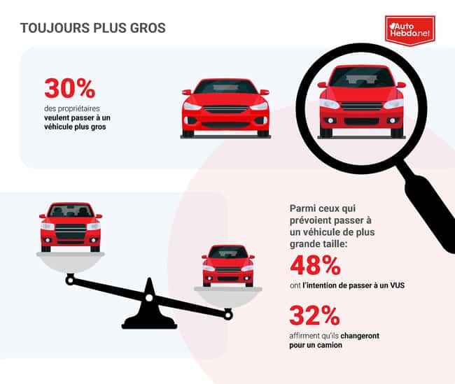 Un nouveau sondage publié par AutoHebdo.net révèle que de plus en plus d’acheteurs canadiens de voitures désirent de plus gros véhicules, citant comme raisons un espace de chargement plus grand, et des sièges plus confortables et plus nombreux. Ce changement reflète une tendance de plus en plus présente ces dernières années chez les acheteurs de berlines traditionnelles qui préfèrent maintenant des véhicules multisegments, des VUS et des camions plus gros.