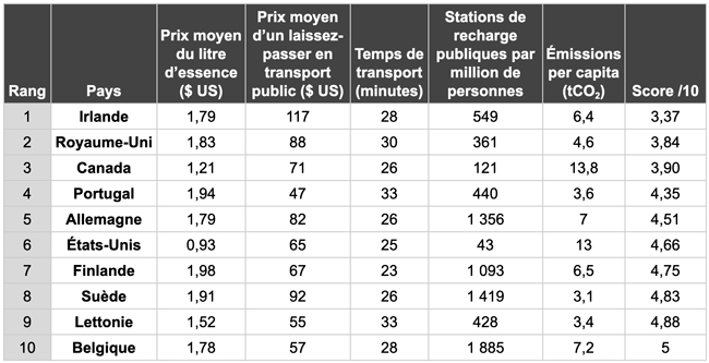 L’Irlande est le pire pays pour les personnes qui doivent voyager du domicile au travail, ayant notamment le coût le plus élevé en matière de laissez-passer en transport public, qui s’est élevé en moyenne à 117 dollars par mois. En fait, l’Irlande a obtenu des résultats assez médiocres sur tous les facteurs que nous avons examinés autres que ses émissions de CO2. L’Irlande a été suivie par ses voisins du Royaume-Uni, qui ont obtenu une note de 3,84 sur 10.