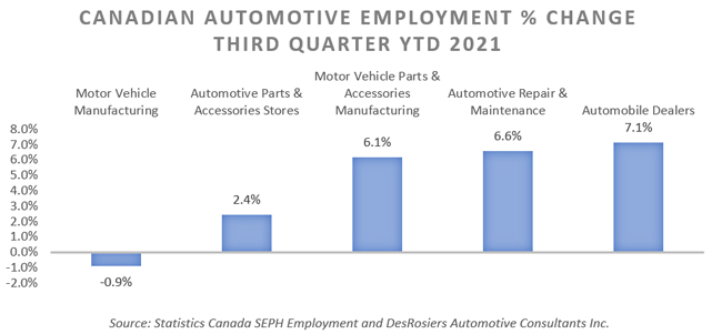 Bien que le nombre d’emplois ait suivi une tendance à la hausse en moyenne, toutes les parties du secteur de l’automobile n’en ont pas bénéficié. Les chiffres d’emploi dans le secteur de la fabrication de véhicules automobiles sont demeurés inférieurs aux chiffres de 2020 et bien inférieurs à ceux de 2019. Bon nombre des secteurs clés de l’industrie de l’automobile ont réussi des hausses à un chiffre à la fin du troisième trimestre, ce qui a encore laissé le nombre d’emplois en deçà des niveaux pré-pandémie. L’augmentation moyenne de 7,1 % de l’emploi des concessions – bien qu’elle soit un spectacle bienvenu – signifiait toujours que le chiffre moyen de 2021 à la fin du troisième trimestre était de 10,7 % en retard par le même temps en 2019; un déficit de plus de 17 000 employés. « Les deux grands employeurs du secteur de l’automobile – les concessions et les installations de réparation et d’entretien – ont tous deux affiché une croissance en 2021 », a commenté Andrew King, associé directeur de DAC « Cependant, quand l’emploi reviendra à des niveaux historiques, reste une question ouverte – alors que l’industrie s’adapte et évolue pour répondre aux nouveaux modèles d’achat et aux besoins des consommateurs. »