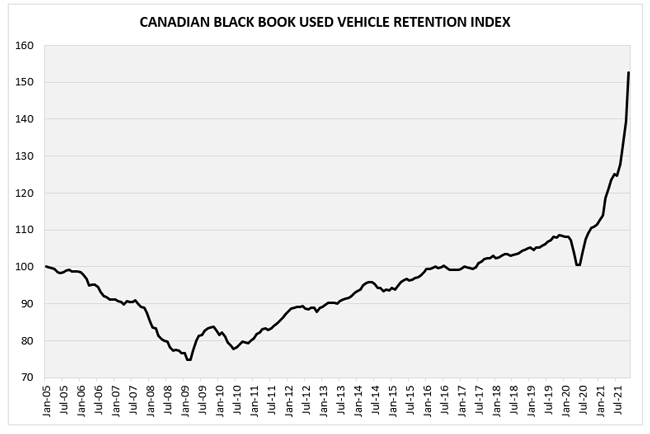 Canadian Black Book, connu dans l’industrie de l’automobile pour fournir des prix, des données et des analyses indépendants, précises et en temps opportun sur les véhicules au Canada, a publié son indice de rétention des véhicules d’occasion pour novembre 2021. L’indice a grimpé en flèche pour atteindre un autre sommet historique de 152,6 points, avec une croissance incroyable de 13,2 points par rapport à octobre, qui était le précédent record.