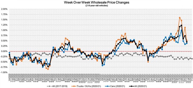 - Dans l’ensemble, les prix de gros pondérés en fonction du volume des voitures d’occasion ont augmenté de 0,38 % pour la semaine, poursuivant la tendance positive pour la 16e semaine consécutive.