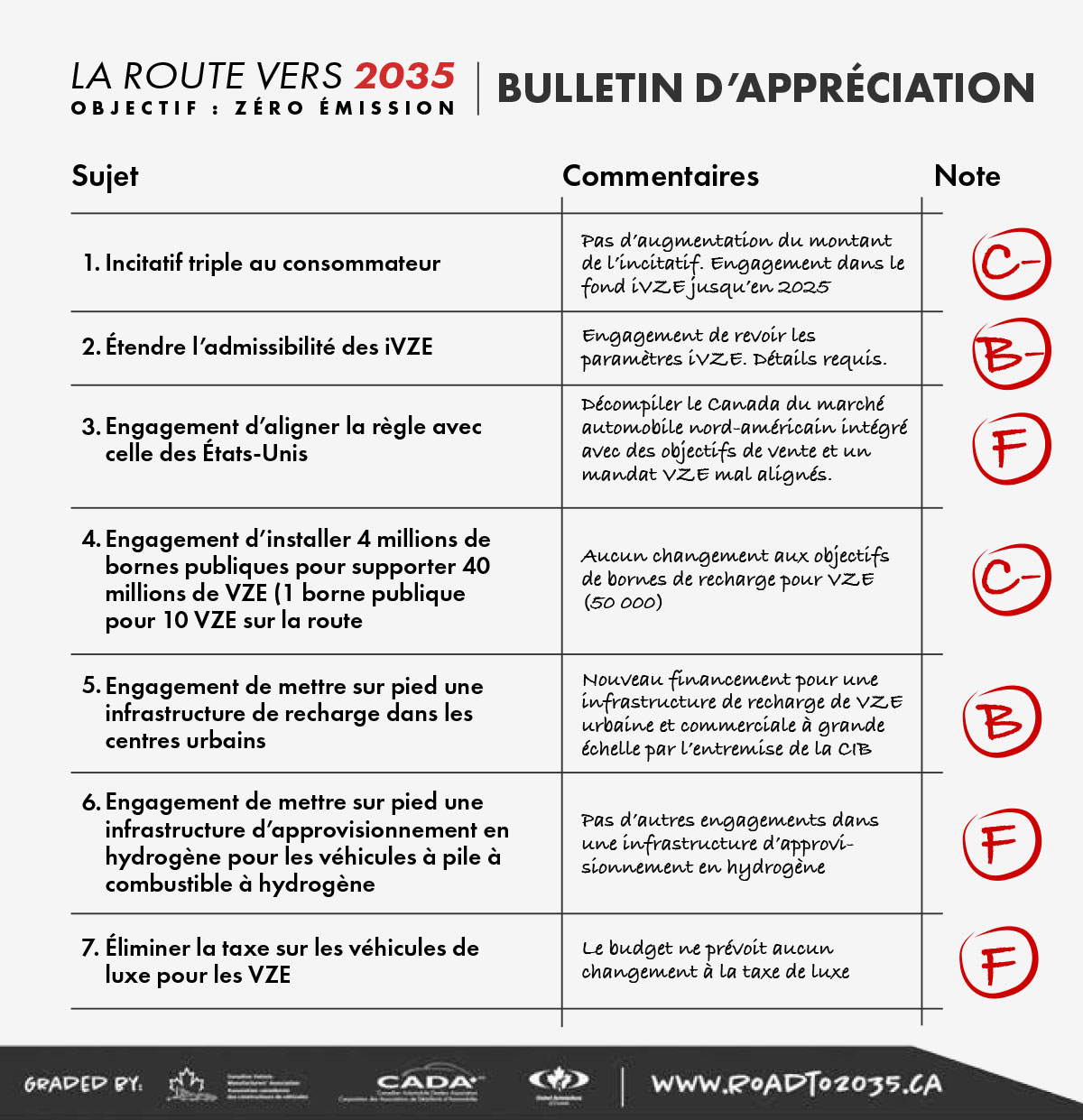 Le bulletin d’appréciation a classé les choix du gouvernement fédéral en fonction des sept principaux changements de politique présentés sur le site web du secteur de l’automobile Roadto2035.ca :