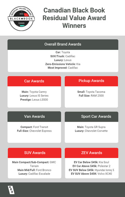Voici la liste complète des gagnants du prix de la meilleure valeur résiduelle du Canadian Black Book 2022 :