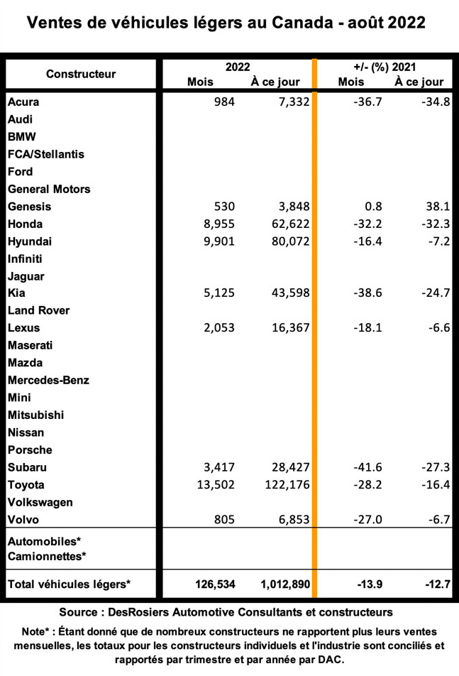Les ventes de 126 534 véhicules au Canada en août ont diminué de 13,9 % par rapport au même mois de l’an dernier, selon les estimations de DesRosiers Automotive Consultants (DAC). Il s’agit du chiffre de ventes le plus bas en août depuis 1999, selon Andrew King, associé directeur chez DAC.