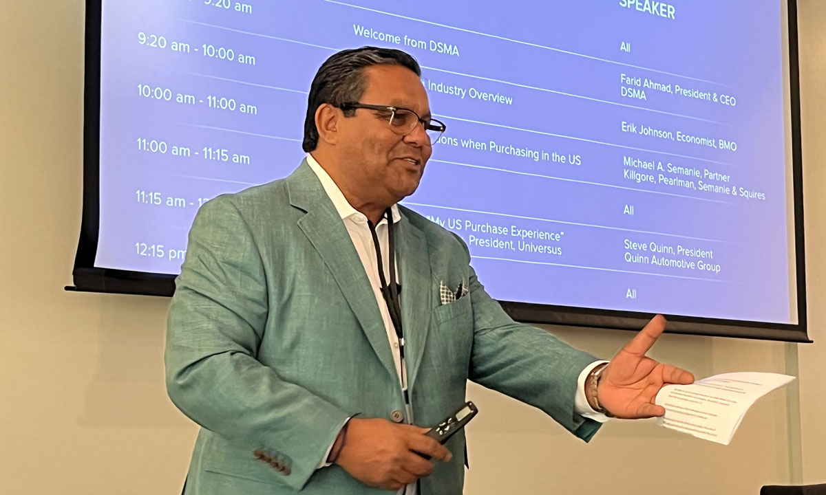 Farid Ahmad, président et chef de la Direction de DSMA, a donné le coup d’envoi de la journée avec un mot de bienvenue préparant le terrain pour la journée. « De nombreux groupes de concessions au Canada ont déjà fait l’expérience du marché aux États-Unis », a déclaré M. Ahmad. « Ils ont beaucoup de succès. »