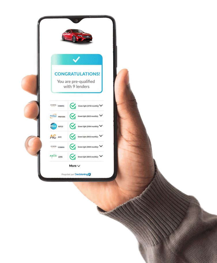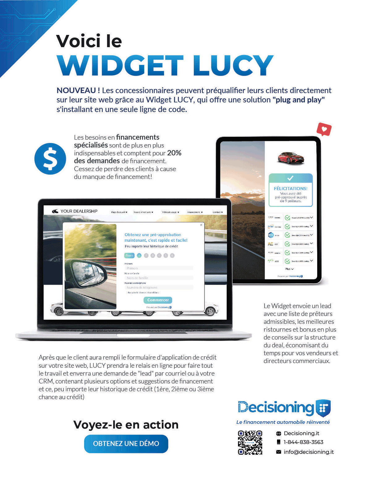 Ce qui distingue le Widget, c’est son moteur de décision alimenté par l’intelligence artificielle, qui est désormais intégré directement sur le site web des concessionnaires. Cette intégration simplifie encore davantage le processus de financement en offrant aux concessionnaires un accès direct à cette puissante technologie via leur propre site web. Donc, plus besoin de plateforme puisque toute l’information est envoyée à la concession via un « lead web ».