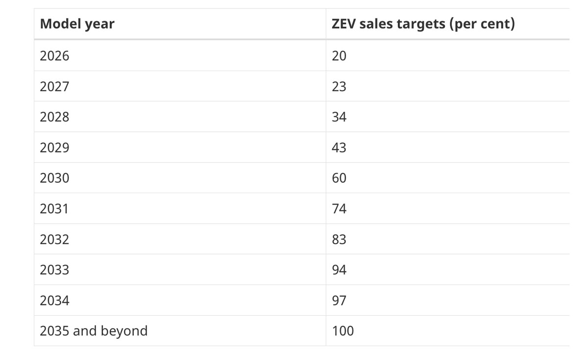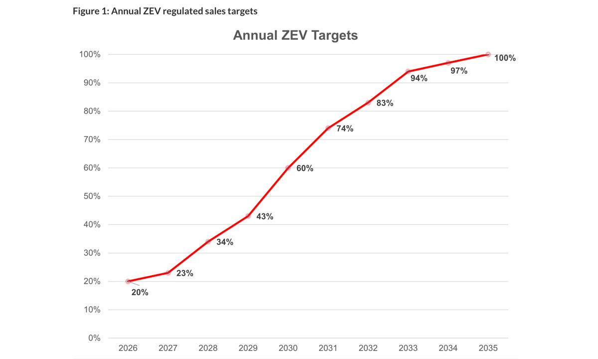 Les nouvelles normes maintiennent un objectif de ventes de 100 % zéro émission d’ici 2035 avec des objectifs intermédiaires d’au moins 20 % d’ici 2026 [environ le double des niveaux de ventes actuels] et d’au moins 60 % d’ici 2030.
