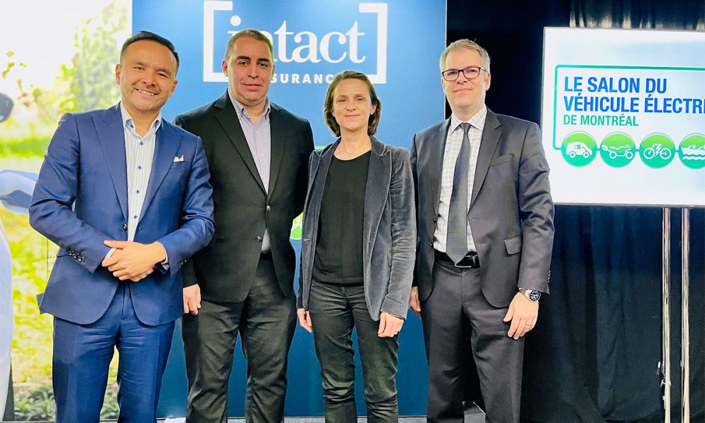 Ian P. Sam Yue Chi, pdg CCAQ; Yves Racette, directeur développement des programmes NAPA NexDrive; Blandine Sebileau, chargée de projet électrification des transports Equiterre; Alain Fortin, 1er vice-président Intact Assurances