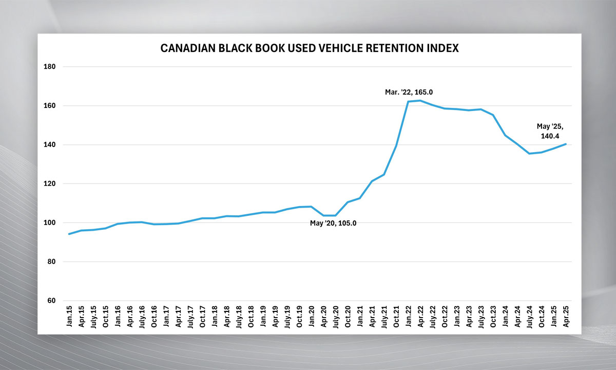 L’équipe du Canadian Black Book (CBB) vient tout juste de publier son dernier indice de rétention des véhicules d’occasion. Pour mai 2025, l’indice s’établit donc à 140,4 points, contre 140,3 en avril. Sur un an, il s’agit d’une augmentation de 2,0 %.