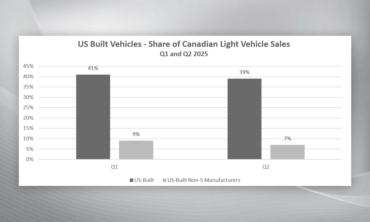 Selon l’analyse de Desrosiers Automotive Consultants (DAC), au deuxième trimestre 2025, les véhicules légers fabriqués aux États-Unis ont représenté environ 39 % des ventes de véhicules légers neufs, soit une légère baisse par rapport aux 41 % du premier trimestre. Si l’on exclut les cinq constructeurs qui construisent au Canada, ce chiffre tombe à 7 % du marché des ventes, contre 9 % au premier trimestre. Globalement, l’approvisionnement en véhicules semble donc avoir peu évolué jusqu’à présent, ce qui n’est pas surprenant étant donné que la plupart des constructeurs adoptent une approche attentiste dans les négociations commerciales et que bon nombre des véhicules vendus au deuxième trimestre provenaient des importants stocks importés avant l’imposition de contre-tarifs.