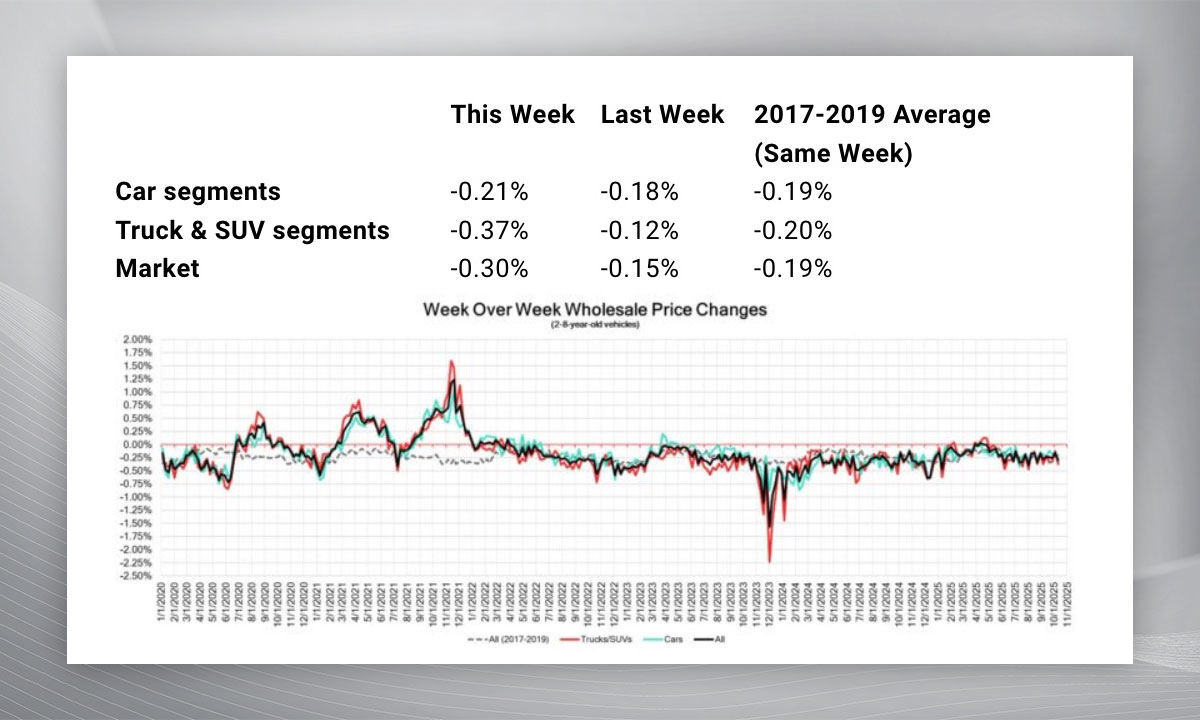 Pour la semaine se terminant le 11 octobre 2025, la tendance se maintient, soit une baisse pour la plupart des segments automobiles. Le marché canadien de gros des véhicules d’occasion a enregistré une baisse de -0,30 % pour cette mi-octobre 2025. Le segment des voitures a été moins touché, mais affiche tout de même -0,21 %. Pour les camions et les VUS, on parle plutôt de -0,37 %.