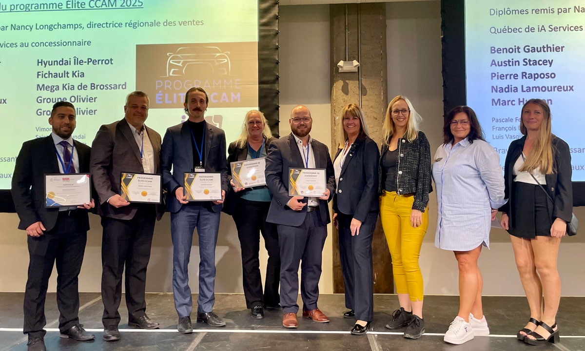 Avec l’appui de Nancy Longchamps, directrice formation Québec, iA Services aux concessionnaires, pour le programme Élite, le diplôme a été remis à Benoit Gauthier (Hyundai Île-Perrot), Austin Stacey (Fichault Kia), ainsi qu’à Nadia Lamoureux et Marc Hugron (Groupe Olivier).