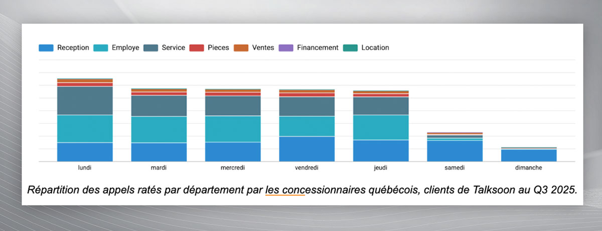 Les données du troisième trimestre confirment une tendance bien établie depuis plusieurs années déjà : le département du service, incluant les aviseurs techniques et la prise de rendez-vous, est encore celui où l’on manque le plus d’appels. Cette situation s’explique par la nature même du travail au département du service : les appels sont nombreux, souvent urgents, et les clients s’attendent à une réponse rapide.