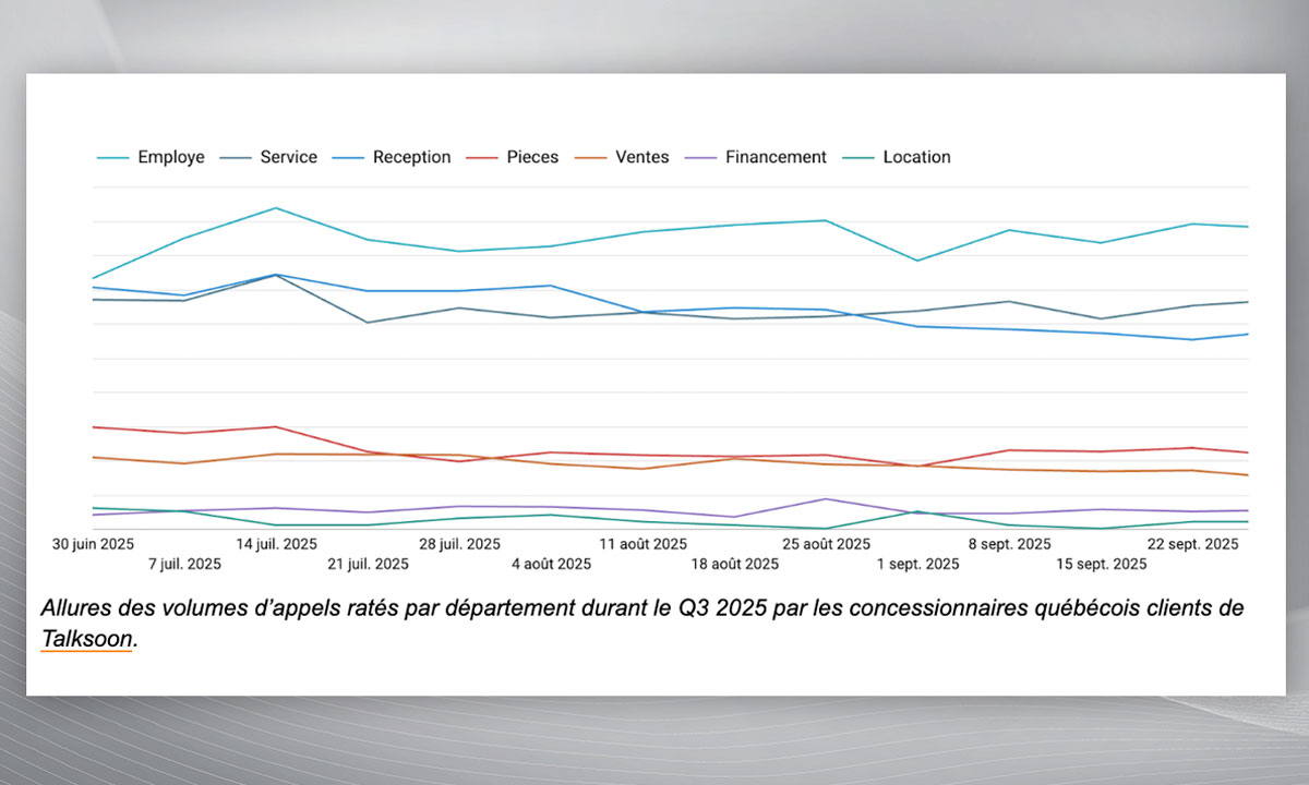 Le troisième trimestre n’inclut pas de période de pointe liée aux changements de pneus, mais l’activité est demeurée soutenue tout au long de l’été 2025. Les volumes d’appels sont restés constants dans la plupart des départements, ce qui montre que la demande pour les produits et services des concessionnaires québécois demeure forte.