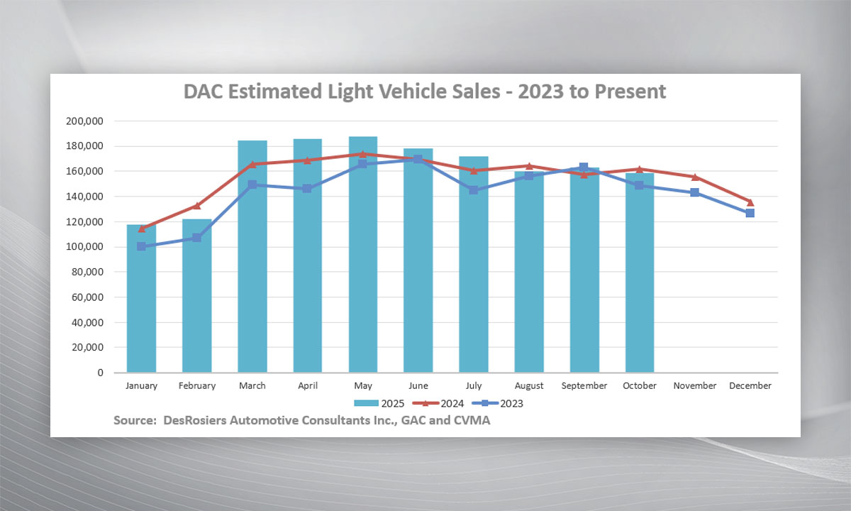 Pour le Canada dans son ensemble, le marché, selon les estimations de DAC, s’est établi à un bon chiffre de 159 000 unités, en baisse de 1,8 % par rapport aux 162 000 unités d’octobre 2024, gonflées par les prix québécois, mais qui reste plus qu’honorables. « Les ventes d’octobre ont été solides, avec un taux annuel désaisonnalisé (SAAR) de 1,94 million – le plus haut niveau enregistré depuis le premier trimestre, où la demande refoulée liée aux pénuries de semi-conducteurs stimulait encore les ventes. Cependant, compte tenu de la persistance des tensions commerciales, des menaces potentielles de nouvelles perturbations liées aux semi-conducteurs et de la faiblesse persistante des indicateurs économiques, il sera intéressant de voir si cette dynamique peut être maintenue,» a mentionné Andrew King, associé directeur chez DAC.