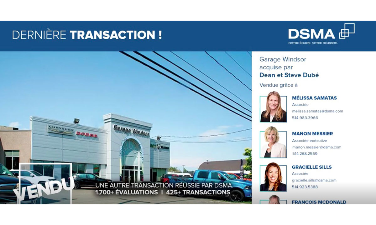 L’entreprise DSMA – Fusions et Acquisitions a dernièrement conclu une nouvelle transaction dans le domaine. Il s’agit du Garage Windsor qui passe des mains de Nicolas Leblond au Groupe Dubé. Le groupe Dubé, tenu par les frères Steve et Dean, …